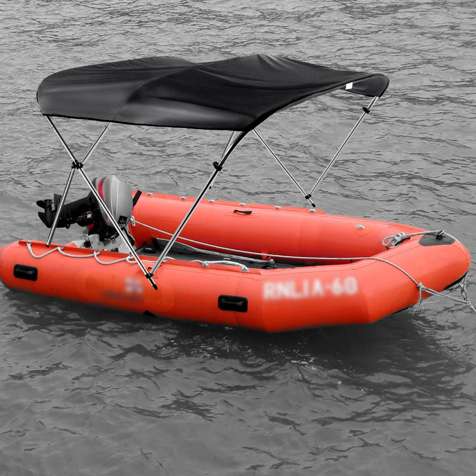 - Three-bow aluminum alloy frame provides stable shade across a 183 cm by 117 cm canopy, designed to fit boats 170–182 cm wide.