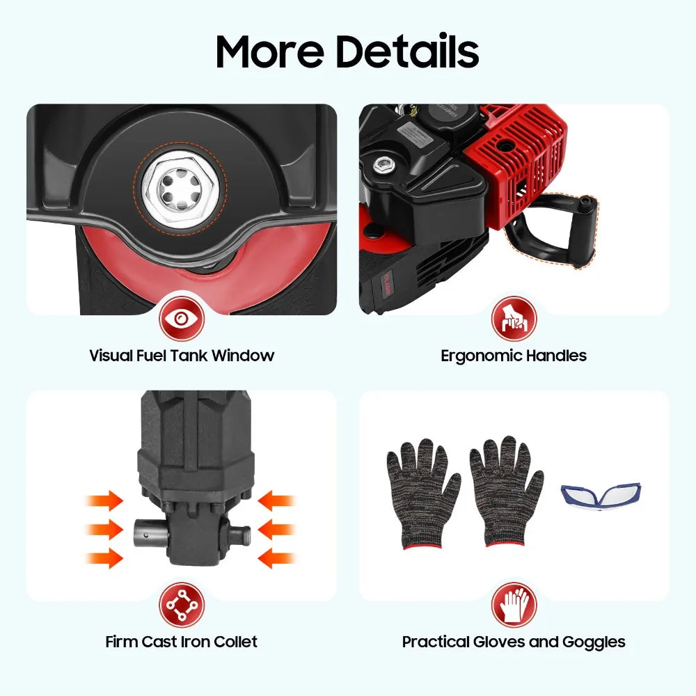- Power and endurance: 52cc two-stroke gas engine with a 25:1 oil-to-gas mix, 1.3 L (43.96 oz) fuel capacity, up to 6500 r/min and 3.5 N·m torque for steady digging with fewer refuels.
