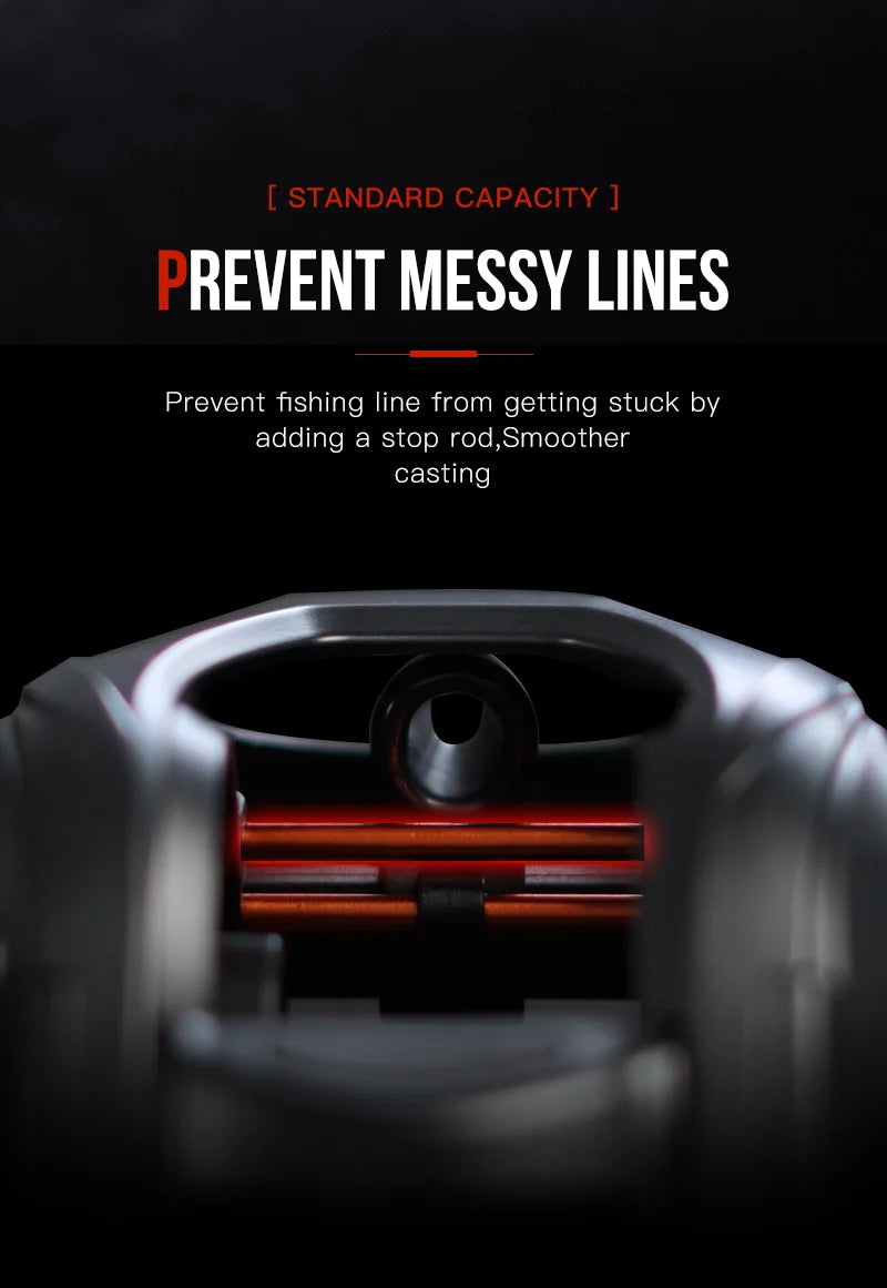 - Smooth operation and line management: 6+1 bearing system with a suspension bearing on the small gear stabilizes mesh between gears, while the tapered guide ring and Stop Rod reduce resistance and prevent tangles for you.